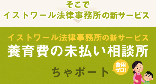 シン・イストワール法律事務所の「養育費の未払い相談所 ~ちゃポート~」は初期費用不要。元夫が支払う養育費の一部を成功報酬として、サービス料を徴収させていただきます。ご相談くださるお母さんの負担金は0円です